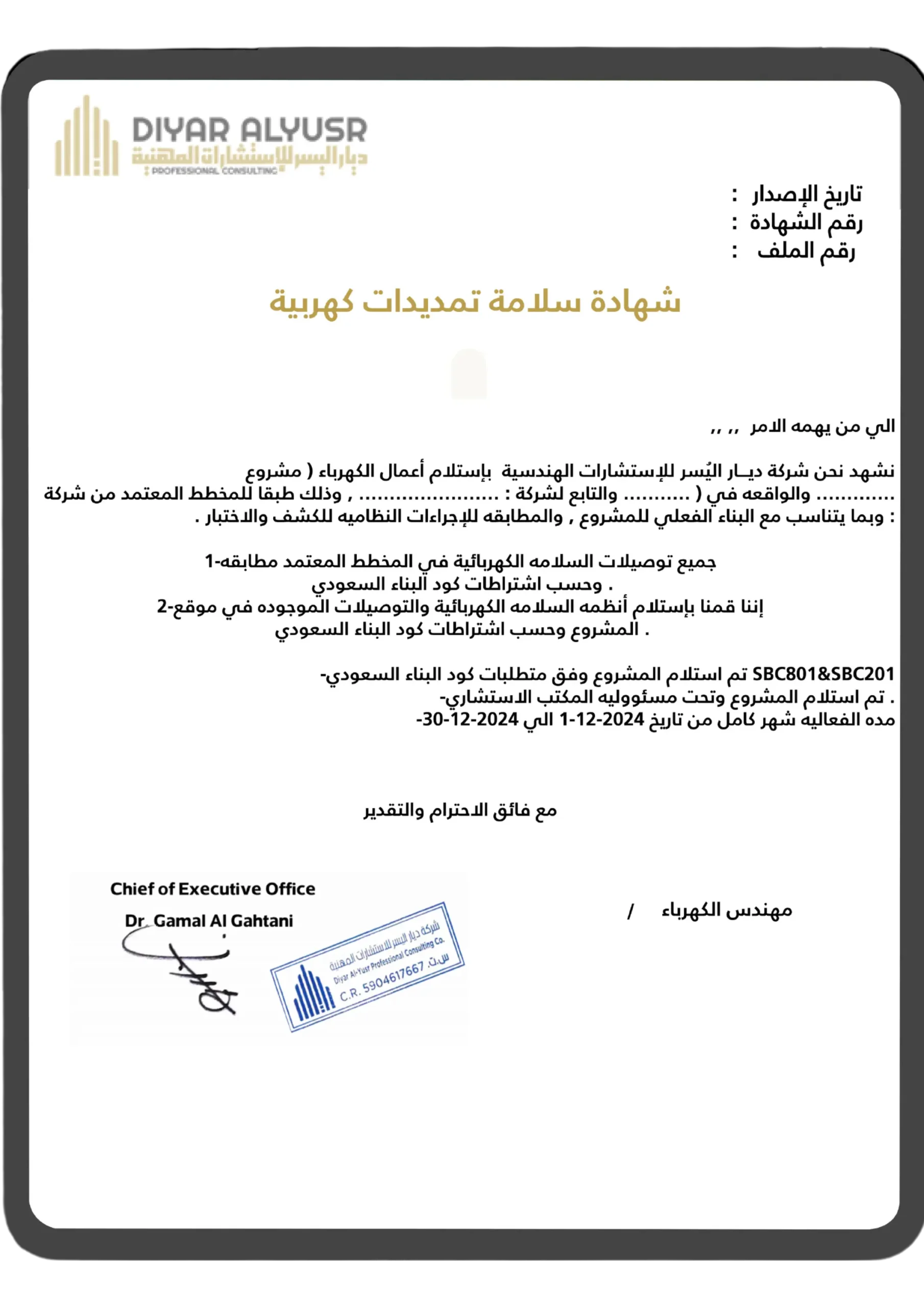 شهادة سلامة التمديدات الكهربائية من شركة ديار اليسر للاستشارات الهندسية تضمن أن التمديدات الكهربائية في منشأتك تتوافق مع كود البناء السعودي. بعد فحص دقيق وعدم العثور على مخالفات، نصدر شهادة معتمدة تثبت سلامة التمديدات، والتي يمكن استخدامها كوثيقة رسمية لتلبية متطلبات مديرية الدفاع المدني.
